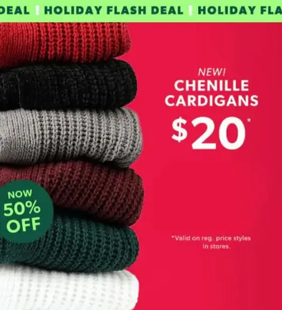 Holiday Flash Deal! Shop in store and get Chenille cardigans for $20.