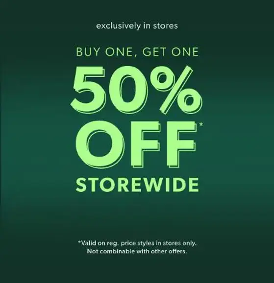 Don't miss out! Shop in store and enjoy buy one, get one 50% off everything.